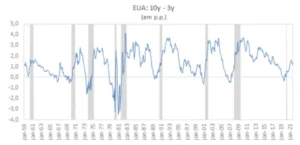 O gráfico a seguir mostra o spread a termo entre os papéis de 10 anos e de 3 anos nos EUA, medida tradicionalmente mais utilizada. As áreas hachuradas representam episódios recessivos datados pela National Bureau of Economic Research (NBER).