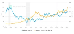 E no gráfico abaixo, a comparação do índice de dólar com a cotação do ouro, nos últimos 24 anos.