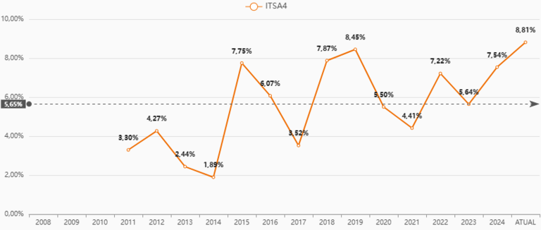 Atualmente, o dividend yield das ações ITSA4 (normalmente as escolhidas pelos investidores que focam em dividendos, e com muito mais liquidez do que as ordinárias) está em 8,81%: