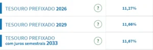 No momento, o Tesouro Prefixado 2026 está rendendo 11,27% ao ano, o Tesouro Prefixado 2029 está rendendo 11,55% e o Tesouro Prefixado 2033 com juros semestrais está rendendo 11,67%.